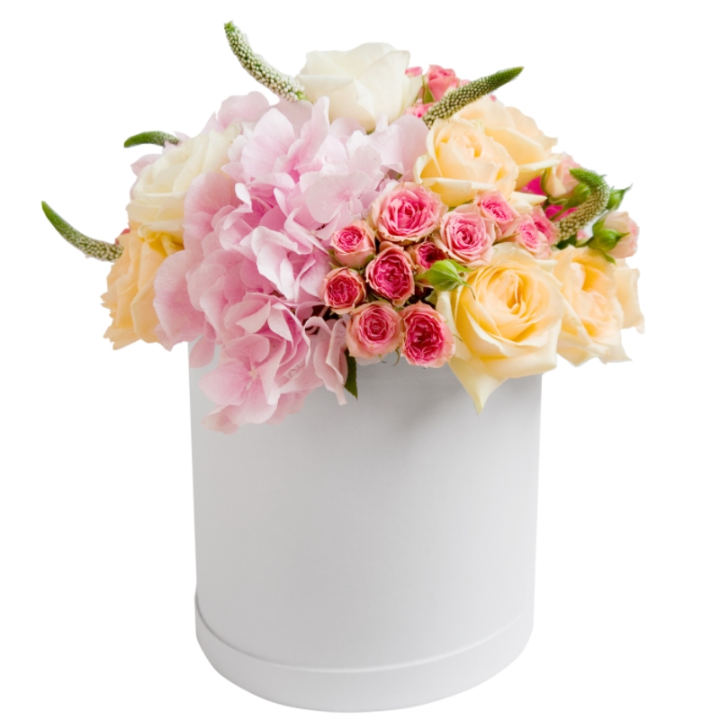 Букет состоит из 1 розовая гортензия, 10 кремовых роз, 4 ветки кустовых роз, зелень, коробка, оазис.
