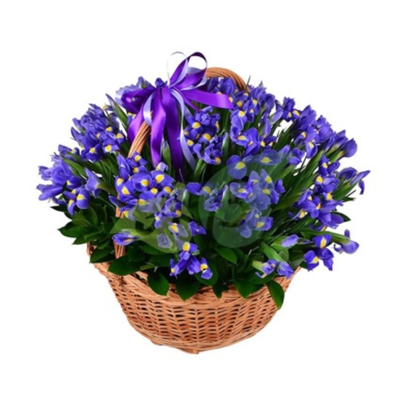 Букет состоит из 51 ирис, зелень, корзина, атласная лента.