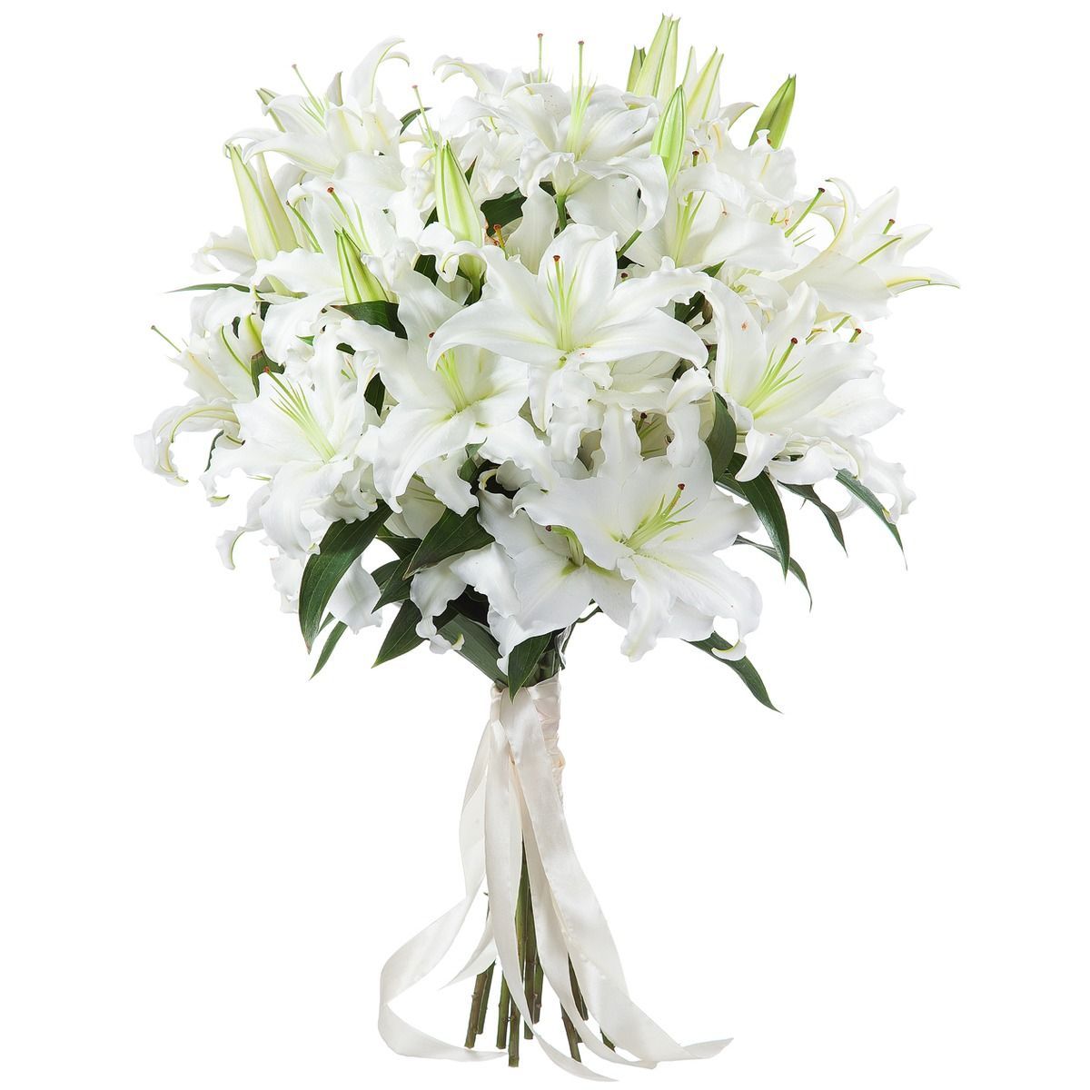 Букет состоит из 11 веток белых лилий, прозрачная упаковка, атласная лента.