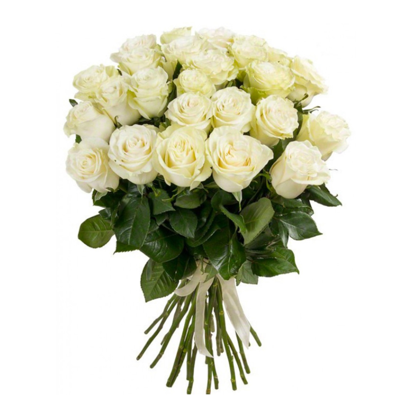 Букет состоит из 25 белых роз, прозрачная упаковка, атласная лента.