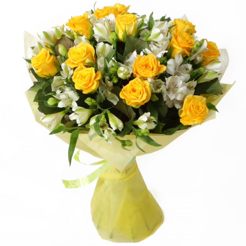 Букет состоит из 15 желтых роз, 9 веток альстромерий, зелень, красивая упаковка, атласная лента.
