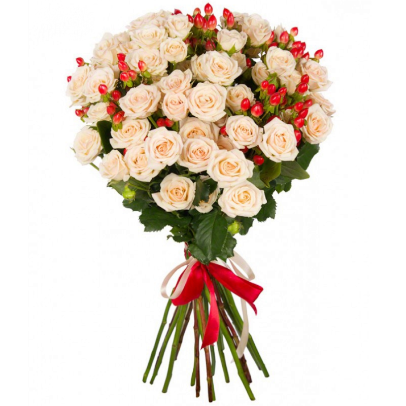 Букет состоит из 15 кустовых роз, 6 веток гиперикума, прозрачная упаковка, атласная лента.