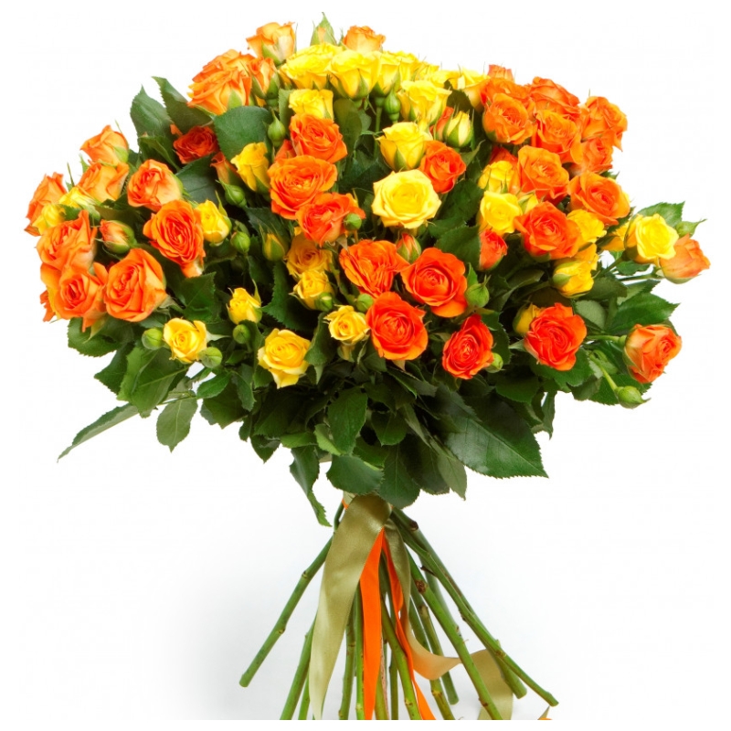 Букет состоит из 13 оранжевых кустовых роз, 8 желтых кустовых роз, прозрачная упаковка, атласная лента.